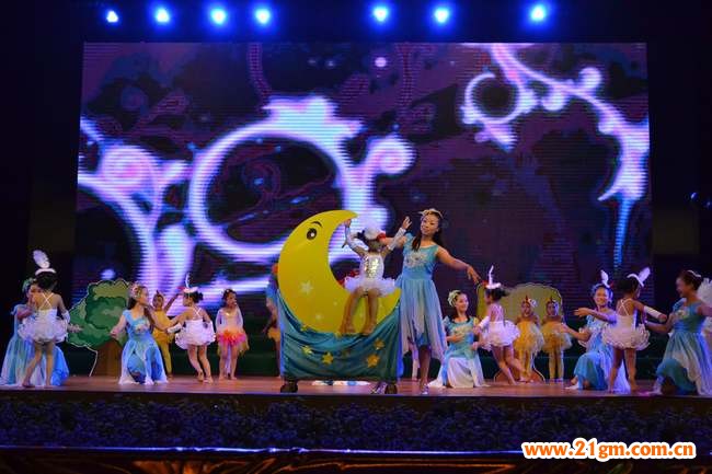 《月亮船》優美的音樂響起后,仙子般美麗的小女孩坐在月亮上面被一群月亮姐姐簇擁著來到臺上。天空亮了、森林綠了、花草復蘇了,年輪之星女神帶著光芒出現在大森林里,一切是那么美好,有如偉才幼兒園這個溫暖的大家庭。