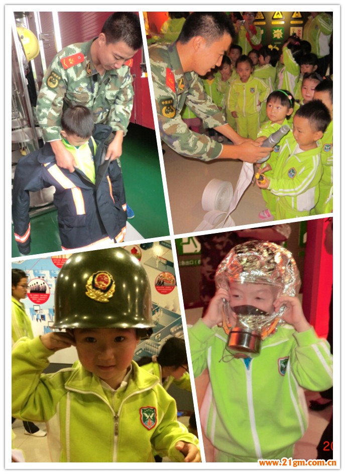 首先,消防員叔叔向小朋友們介紹了消防車輛和一些消防救生器材,并詳細地介紹器材設備的具體用途。為了讓孩子對消防的重要性有更深一步的認識,消防員叔叔還用實物向孩子們展示了消防衣的穿著、防煙帽子的使用、金屬切割機的使用等。寶貝們也躍躍欲試,戴上帽子,穿上服裝,希望自己能像消防員叔叔一樣勇敢帥氣。