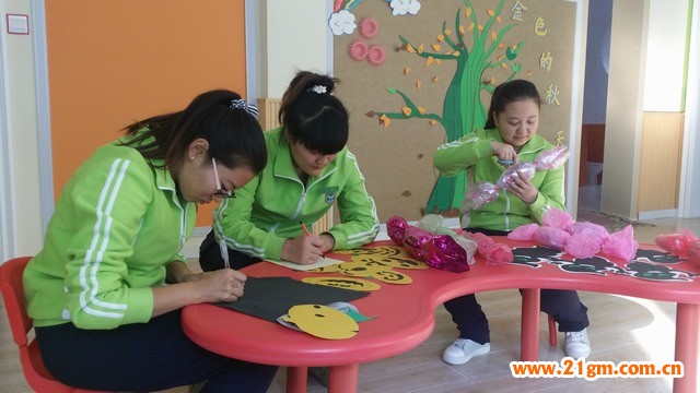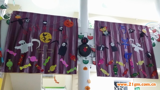 活動前,幼兒園的老師們發揮了節日裝飾的靈感,不僅在班級活動室設置主題墻,還在臥室、衣帽間、班級門窗等地粘貼各種搞怪圖案,最讓家長與幼兒新奇的是在一層陽光大廳用窗簾做為背景布置粘有橘色的南瓜燈、彩色的糖果、可怕的小鬼、黑色的蝙蝠、帶高帽的女巫等圖片,并用白色氣球畫上了表情,拉線拴掛,整個環境氛圍神秘又搞笑,增添了萬圣節的情趣。家長們也提前為幼兒精心準備了面具與服飾,和小朋友一起制作放有手電、蠟燭照亮的桔色南瓜燈,共同期盼著萬圣節的到來。