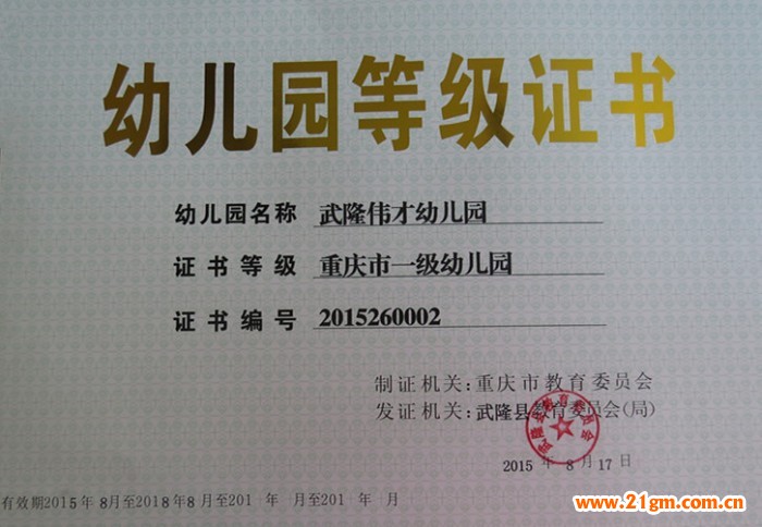 2015年6月29日對武隆偉才幼兒園來說是個特別重要的日子,市一級幼兒園評估小組對幼兒園進(jìn)行了全面細(xì)致的檢查評估,對幼兒園各項工作給予高度評價并提出中肯意見。經(jīng)過兩個月的嚴(yán)格審核評估,武隆偉才幼兒園于8月份正式通過重慶市一級幼兒園評估驗收,榮獲“市一級幼兒園等級證書”。