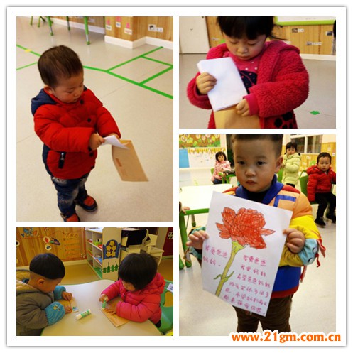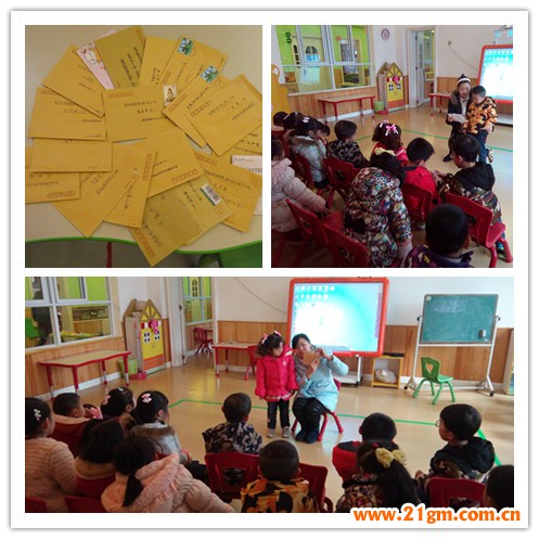 在活動前一周,幼兒園給每個家庭發了兩個信封,其中一封請家長給孩子寫信,并通過郵政局寄給孩子。當孩子們收到寄給自己的信時那種激動和高興,當孩子們認真聆聽并分享一封封情真意切的家書時,不僅讓我們的老師感動不已,孩子們也從中體會到一份濃濃的親情,還有孩子說:“你媽媽怎么寫得這么好啊!”而另一個信封則要求家長寫明自己的收信地址和姓名交回幼兒園,各班根據孩子的年齡特點,通過孩子繪畫、老師代寫孩子的心聲,然后讓孩子自己裝信、粘貼郵票等。