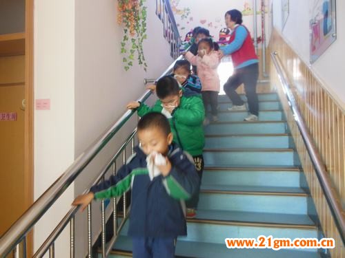 11月29日活動一開始,各班老師按照演練方案,通過廣播向各班下達了疏散撤離的命令,警報響起后在各班教師保育員的帶領下,按照指定的疏散路線,幼兒各自手拿濕毛巾,捂住口鼻,彎下腰,手扶樓梯的欄桿,不吵不鬧,緊張而有序的一個接一個,迅速向外撤離。歷時3分鐘后,幼兒全部安全的撤離到了操場。