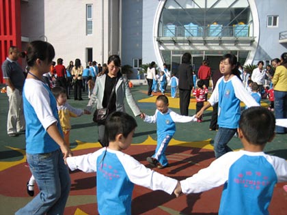 建立一所現代化幼兒園,須選擇衛生、安全的園址。首先,其面積要符合國家衛生標準?!队變簣@工作規 程》規定,小班25人,中班30人,大班35人。一般大型園為10—12個班,中型園為6—9個班,小型園不超過5個 班。無論是何種類型的幼兒園, 園地面積均須按幼兒人均面積來要求,整日制園地人均面積應為15—20平方米 ,寄宿制園地人均面積為20—25平方米。如活動場地和綠化地帶面積不足,可以利用附近公園和社區活動場地 來擴大幼兒的活動空間。環境心理學的研究表明,幼兒園的規模不易過大,因為規模小的幼兒園中孩子們參與 環境的機會更多。