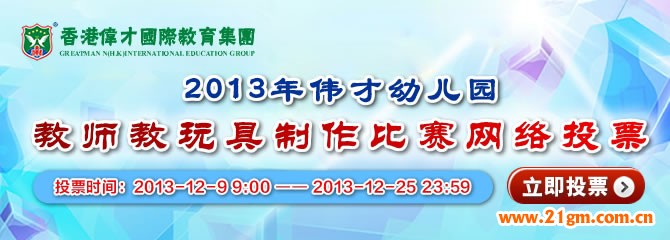 本次比賽是偉才兒研會2013年的壓軸活動,得到了體系內各園所的積極響應。為擴大本次活動的參與規模,提供偉才教師一個更廣闊的展示平臺,偉才兒研會特增加網絡投票環節。通過初步篩選后,獲得參賽資格的區域教玩具作品、制作過程照片及對應設計方案已發布在偉才教育網(網址m.yjysy.com)上。歡迎各園所老師、家長及小朋友積極參與投票。同時各園所可將優秀成果進行借鑒,增進體系內教育教學的交流探討,實現資源共享。