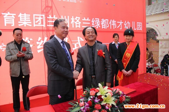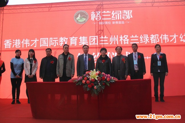 2014年3月15日上午10點,香港偉才教育集團與甘肅普天房地產開發有限公司的簽約儀式隆重舉行,二者聯手打造蘭州“普天•格蘭綠都”小區配套國際化幼兒園。蘭州市七里河區副區長魏麗紅、蘭州市七里河區教育局副局長王延軍、中共蘭州市七里河區西園街道黨工委副書記、辦事處主任王義涵、甘肅普天房地產開發有限公司董事長李忠鑫、香港偉才教育集團董事、副總裁羅駭浪、偉才總設計師席輝、偉才區域總監范冰潔、格蘭綠都偉才幼兒園總園長陳映等嘉賓出席簽約儀式。