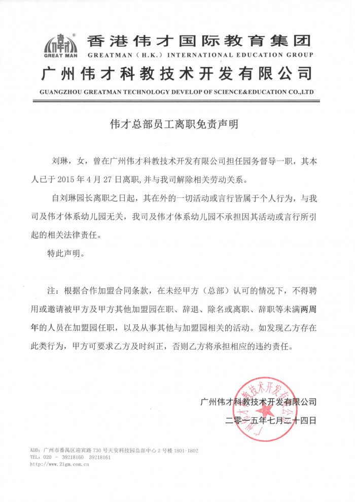 偉才總部員工離職免責聲明