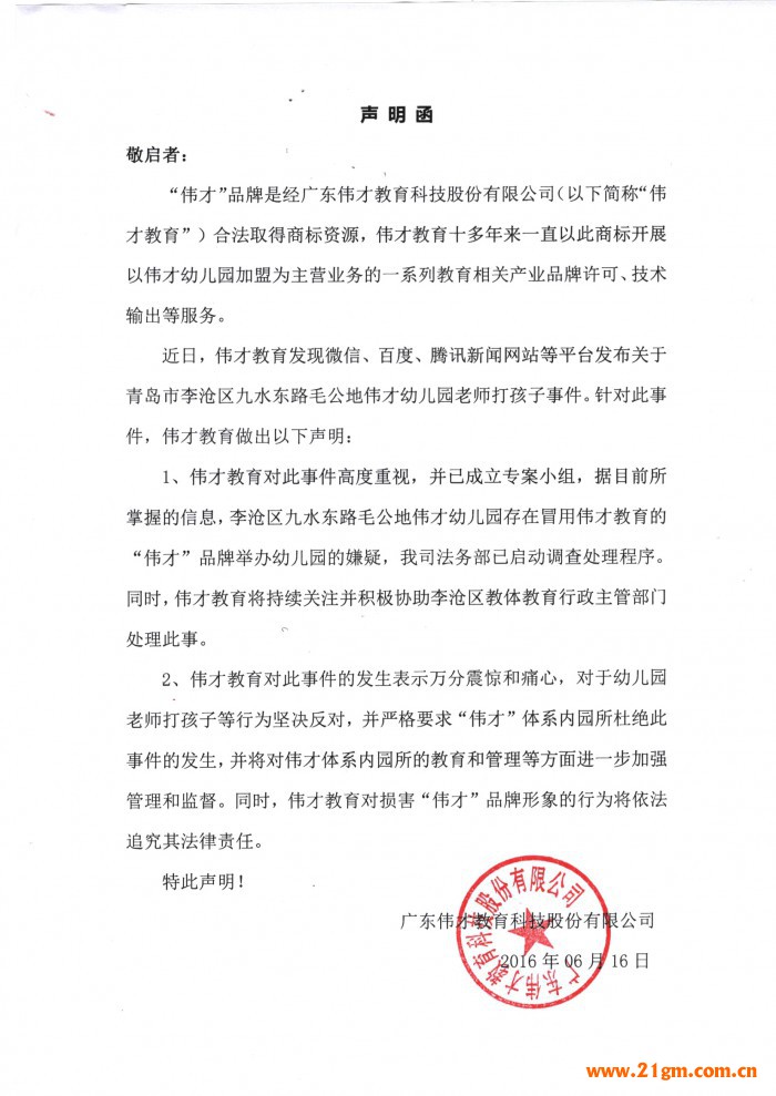 偉才教育對青島李滄“毛公地偉才幼兒園”涉嫌侵害“偉才”品牌事件的聲明