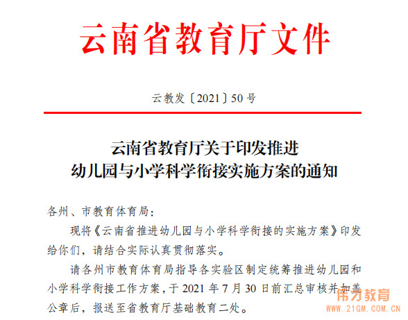 近日,為落實中共中央、國務院印發的《關于學前教育深化改革規范發展的若干意見》《關于深化教育教學改革全面提高義務教育質量的意見》以及《教育部關于大力推進幼兒園與小學科學銜接的指導意見》(教基〔2021〕4 號)精神,引導幼兒園、小學、校外培訓機構和家庭遵循兒童成長規律和教育規律,切實減輕孩子的學業負擔,推進幼兒園與小學科學有效銜接,云南省教育廳制定以下方案:
