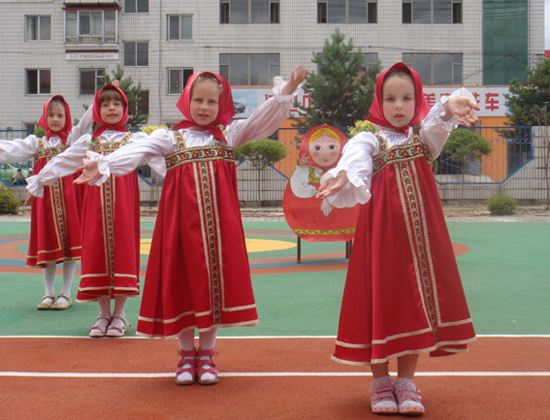活動當天,俄羅斯的小朋友們穿上傳統的民族服裝,在老師的帶領下,跳起了富有濃郁俄羅斯民族特色的舞蹈。偉才幼兒園的老師和小朋友們也表演了自創的健美操。交流互動氣氛異常熱鬧。陪同的兩國家長、小朋友們不斷鼓起陣陣掌聲。雖然語言不通,但是“快樂”的主題是不變的!表演結束之后,俄國的小朋友和家長在偉才老師的帶領下參觀了偉才獨具特色的現代化的教育園,并互贈了禮物。俄方家長還紛紛表示:“如果他們來中國居住,一定會把孩子送進偉才。”