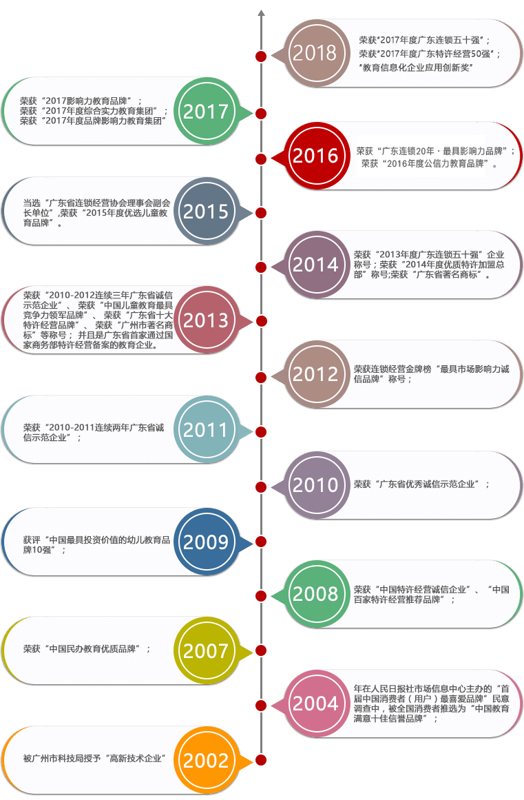 年榮獲“2010-2012連續(xù)三年廣東省誠信示范企業(yè)”、 榮獲“中國兒童教育最具競(jìng)爭(zhēng)力領(lǐng)軍品牌”、 榮獲“廣東省十大特許經(jīng)營品牌”、 榮獲“廣州市著名商標(biāo)”等稱號(hào); 并且是廣東省首家通過國家商務(wù)部特許經(jīng)營備案的教育企業(yè)。